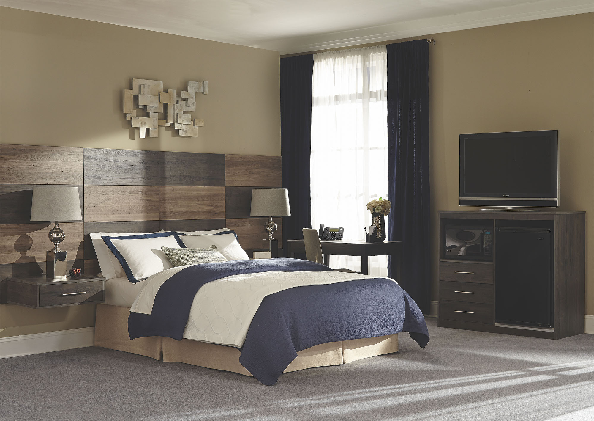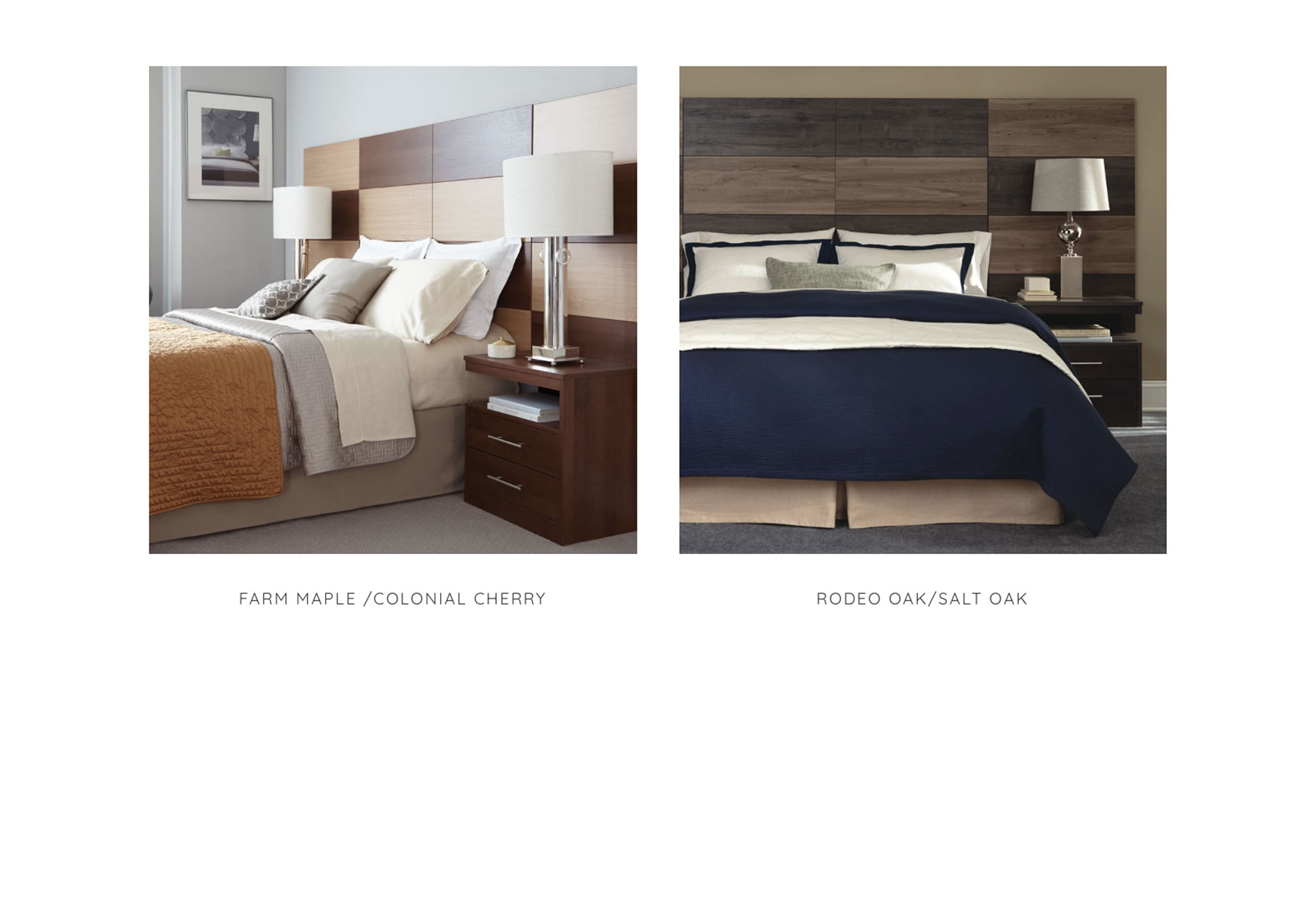 Clean lines displaying contrasting wood tone elements. Cantilever nightstands add to the contemporary vibe. Shown in Farm Maple/Colonial Cherry or Rodeo Oak/Salt Oak finish combinations. Speak with your Account Representative to learn more.