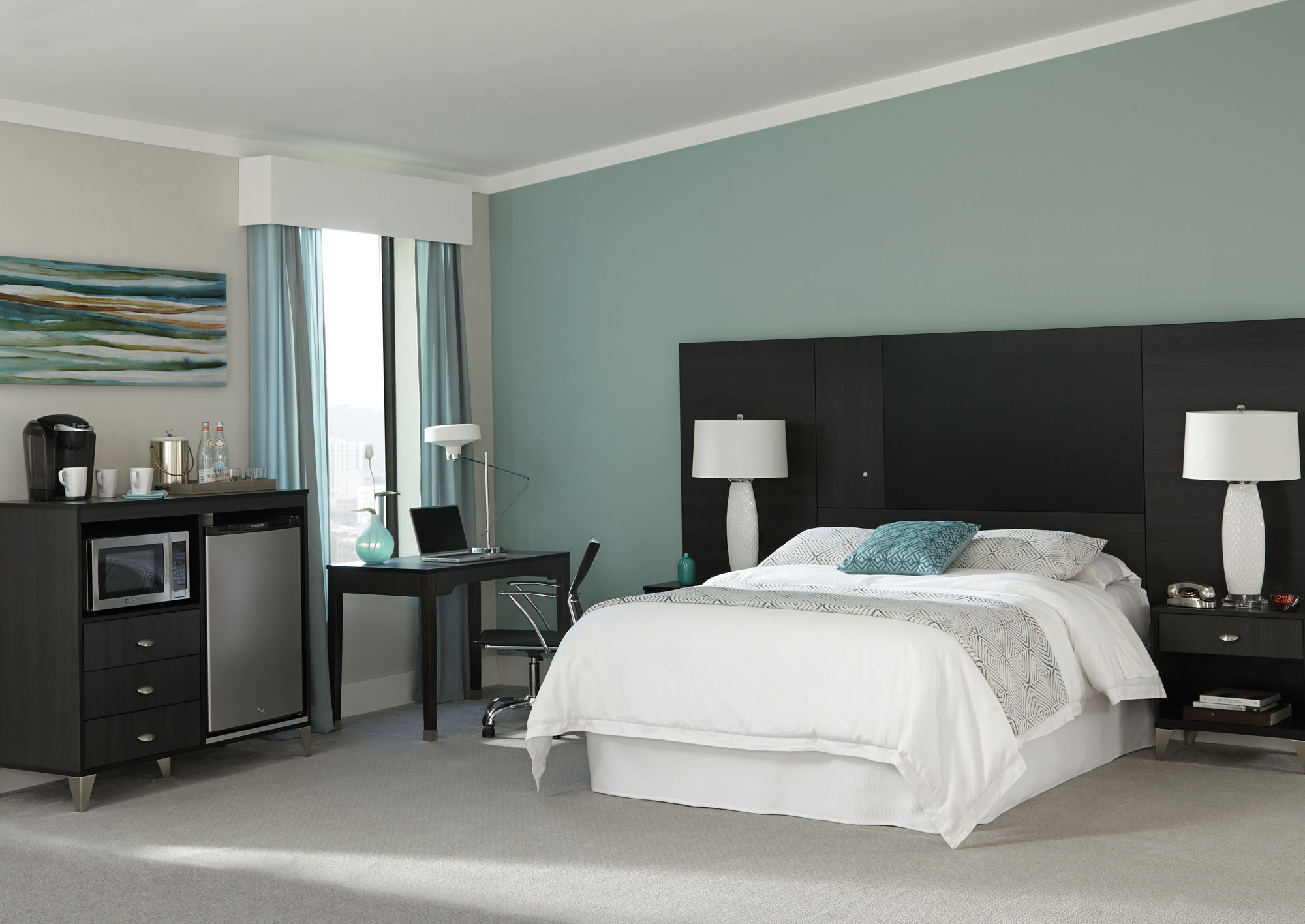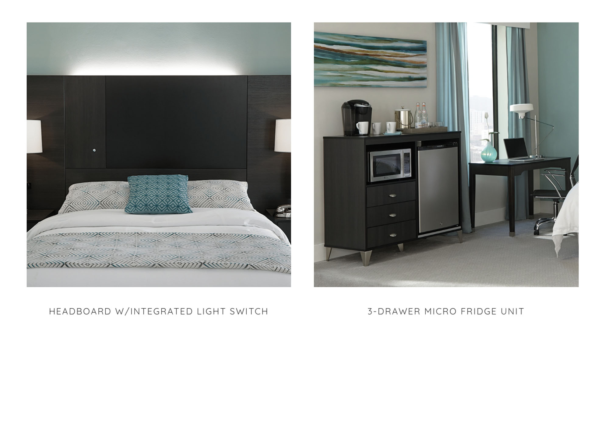beautifully in this unique group featuring built-in ambient lighting in the headboard.